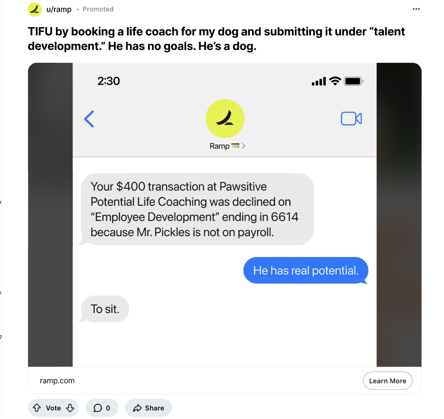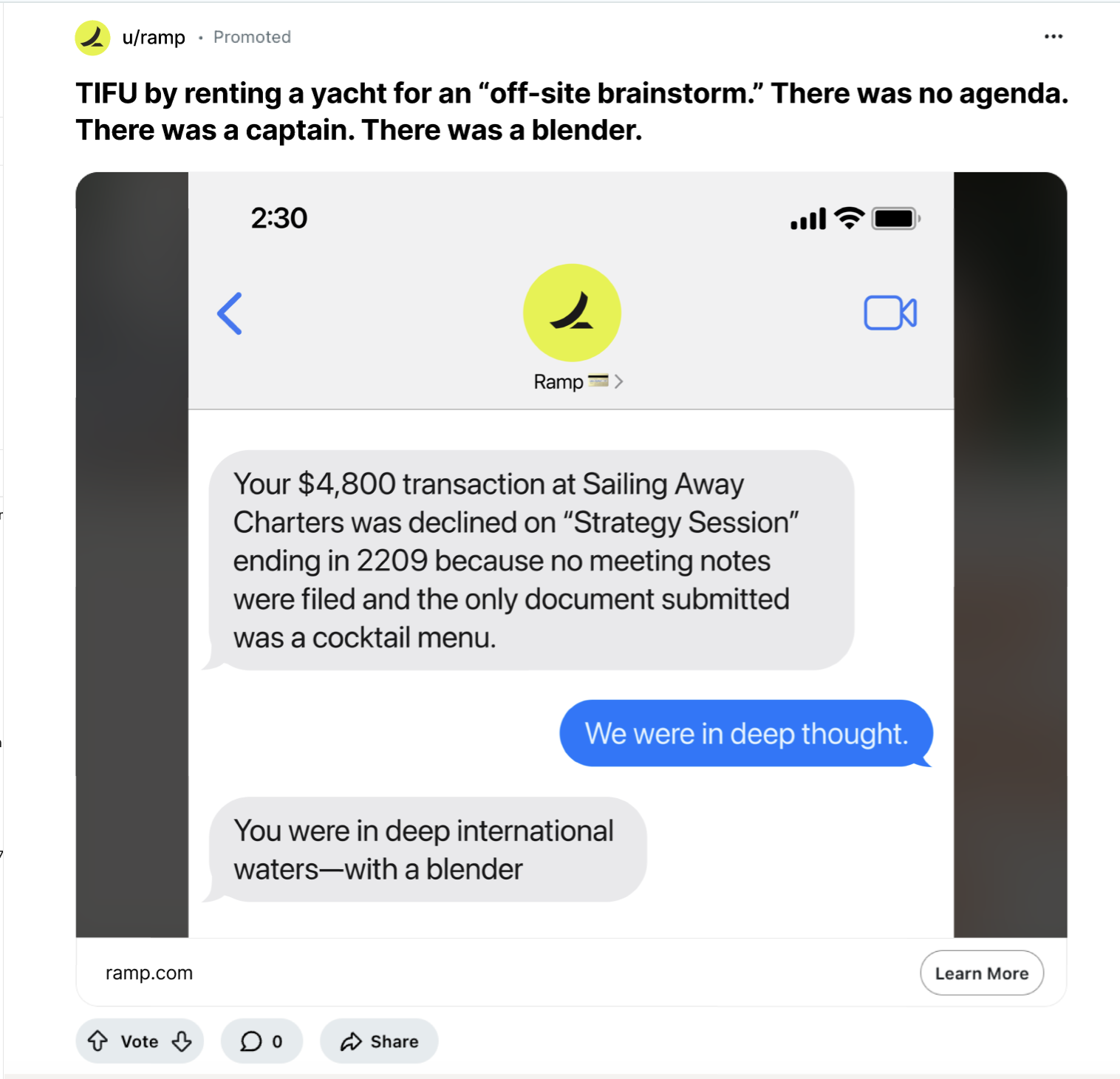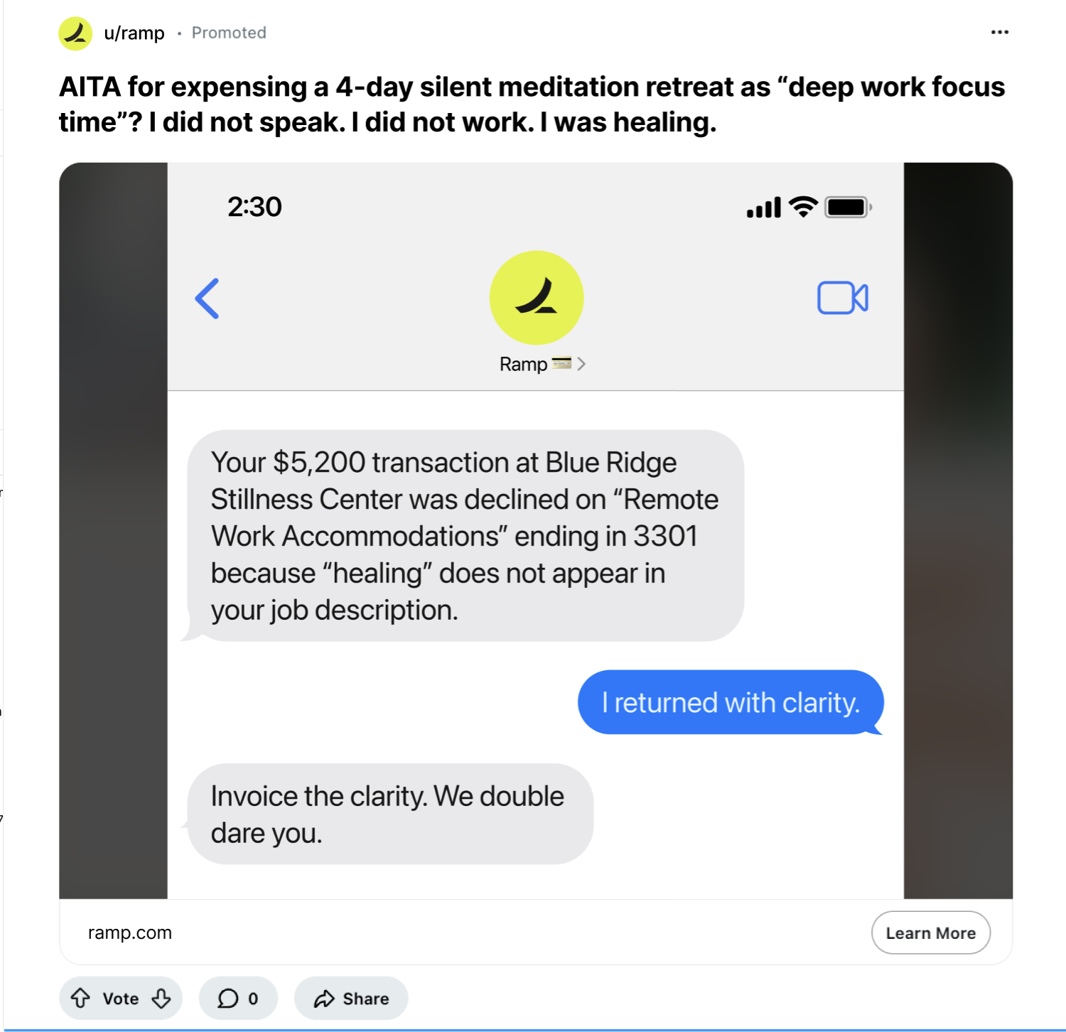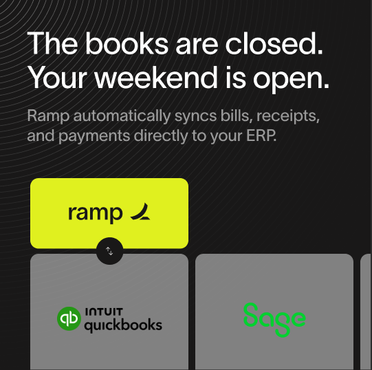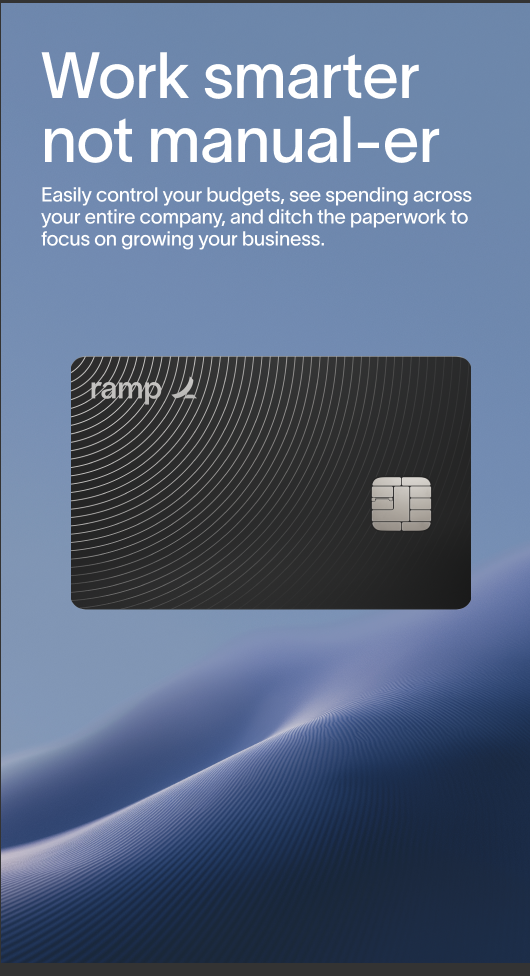 Ramp is the all-in-one finance automation platform that makes expense reports, bill pay, and corporate cards as easy as a click. Think less chasing receipts and approvals, more cash and time back. I created online ads, videos, print, outdoor, and more—because even the smartest finance platform still needs a hype guy to make it look and sound hot.