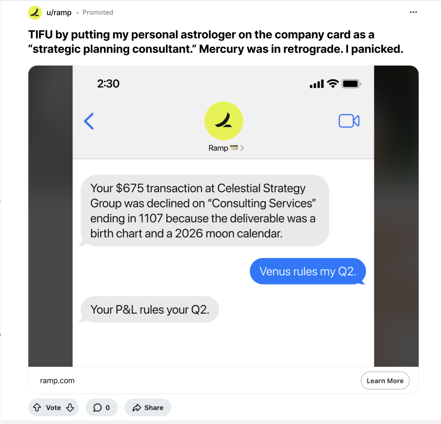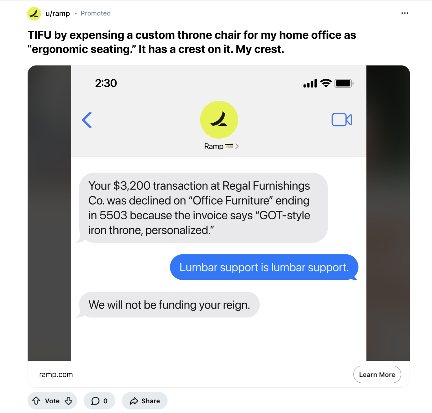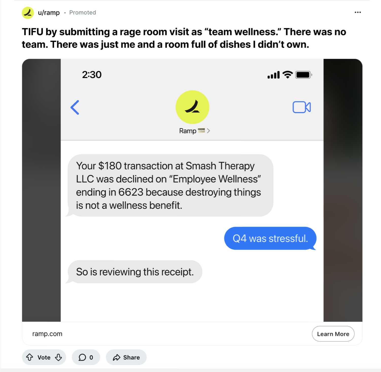 Ramp is the all-in-one finance automation platform that makes expense reports, bill pay, and corporate cards as easy as a click. Think less chasing receipts and approvals, more cash and time back. I created online ads, videos, print, outdoor, and more—because even the smartest finance platform still needs a hype guy to make it look and sound hot.